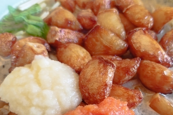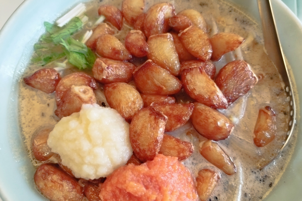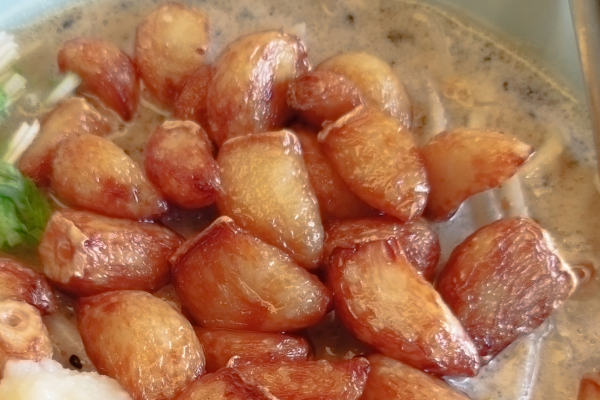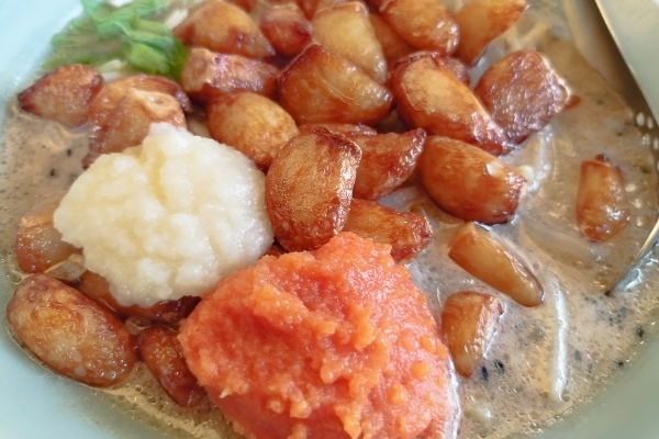 揚げにんにくとシンプルに塩、スープにひたったにんにくとでは。