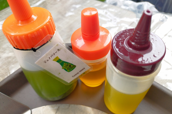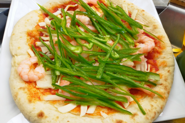 海老とピーマン、ソースなどをトッピングしていく。